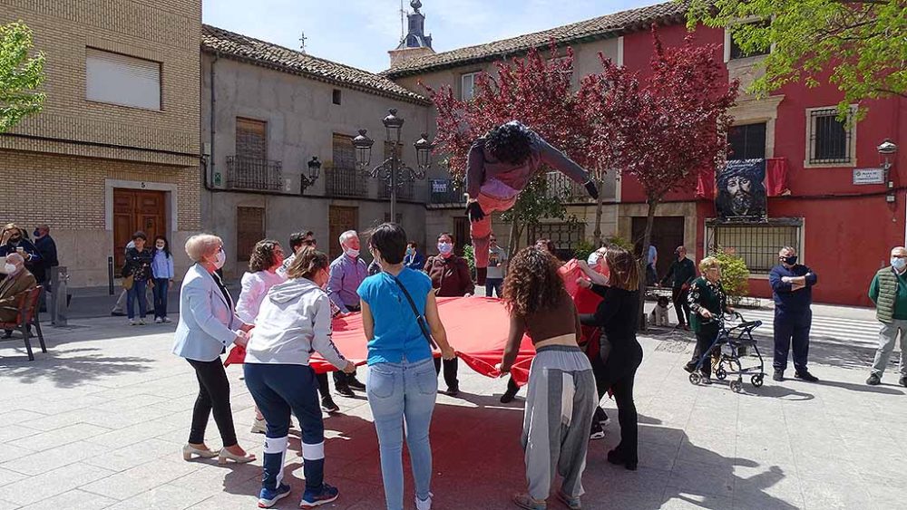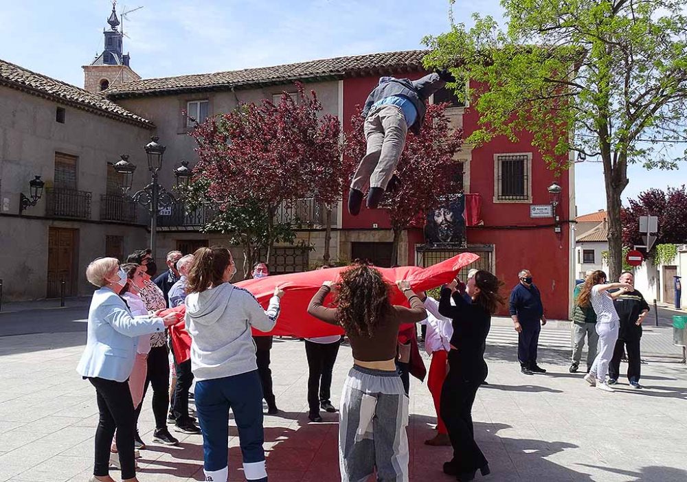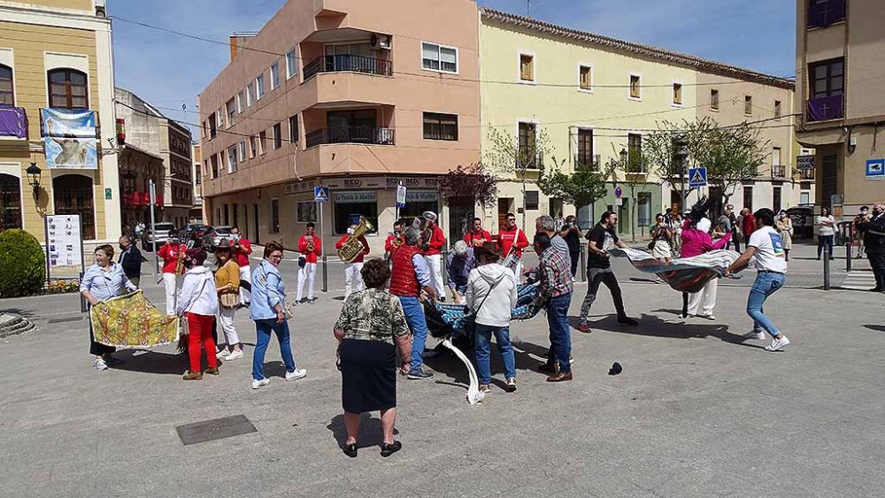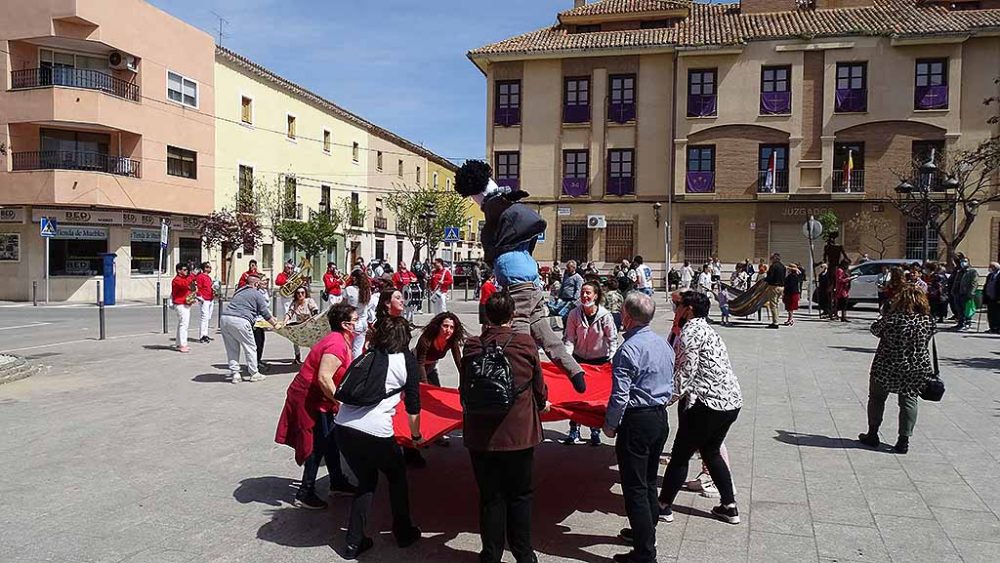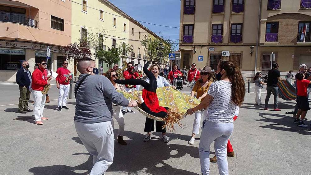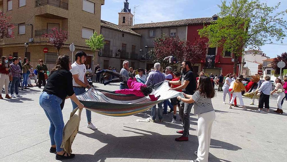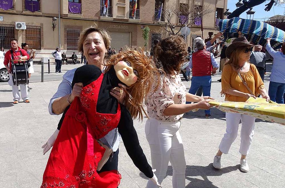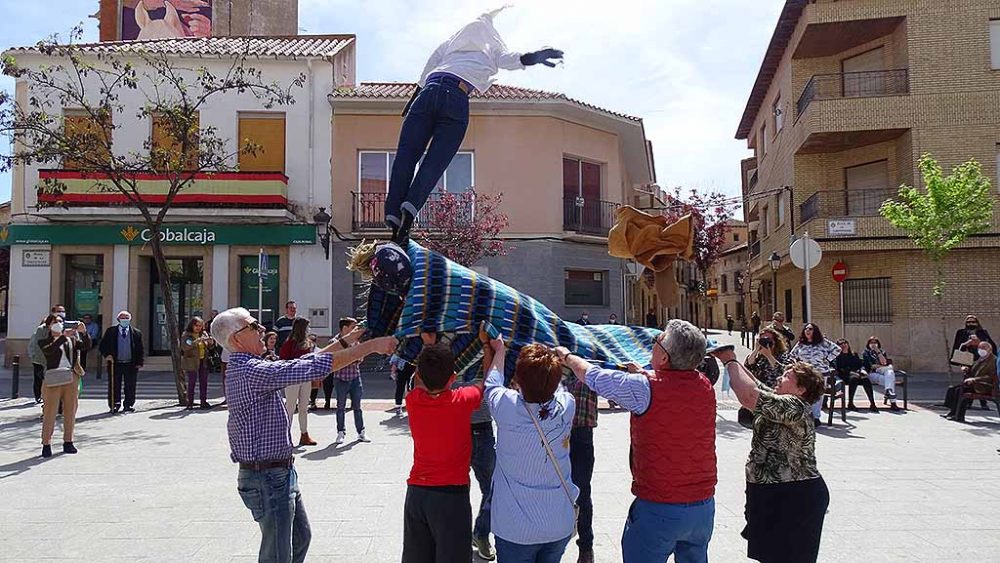 En la mañana de este domingo, la Plaza del Ayuntamiento se vestía de ambiente festivo para recuperar una de las tradiciones más antiguas de la localidad, el manteo de peleles, que se fue perdiendo con el paso del tiempo y que, este año, se ha querido recuperar.