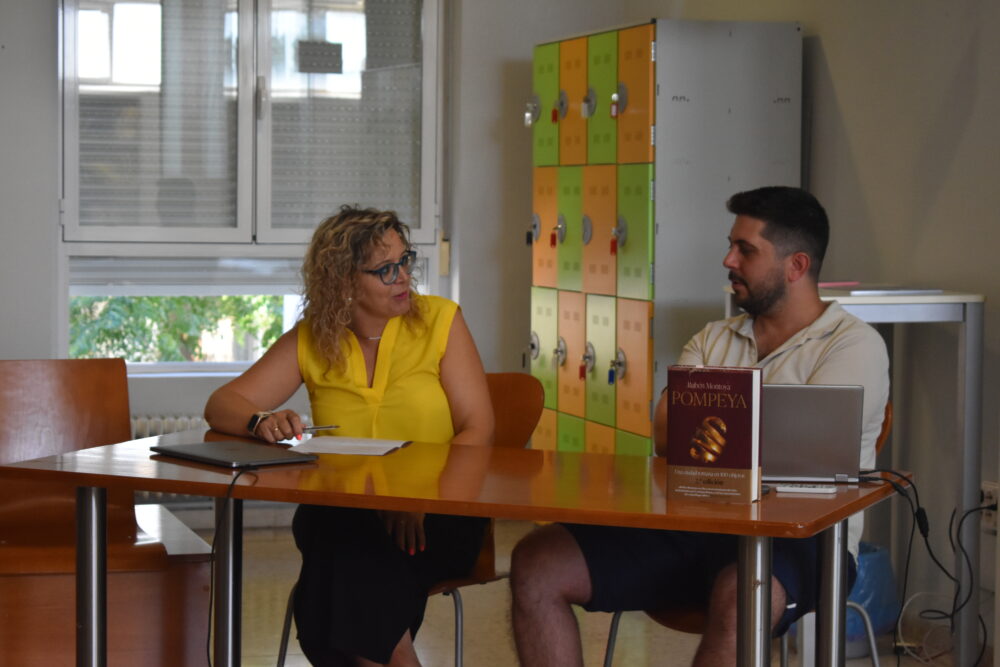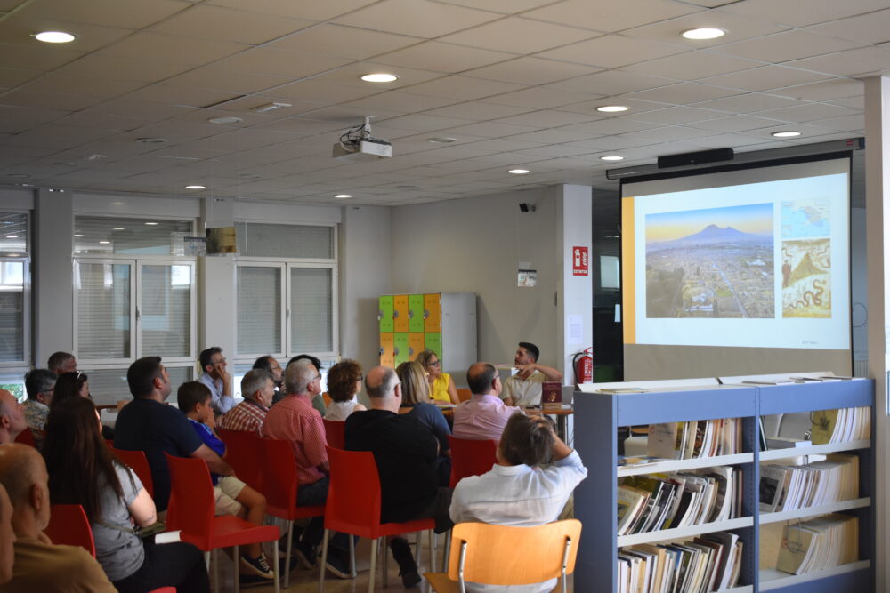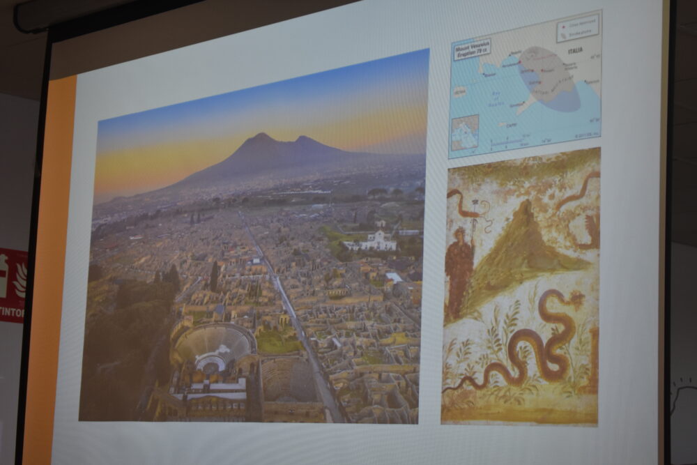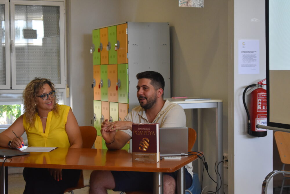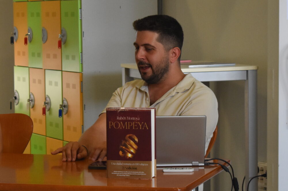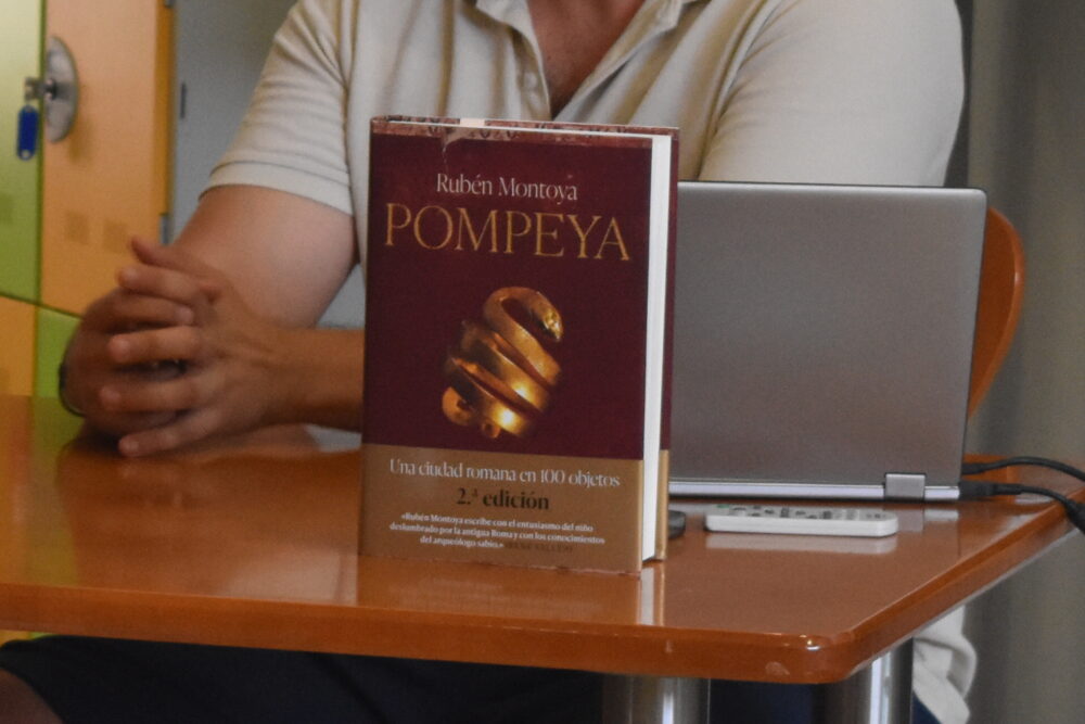 Posteriormente, la directora de la Biblioteca Elena Novillo, quiso preguntarle a Rubén algunas cuestiones de cara a la realización de la obra que, como bien dijo Rubén, “es una obra muy sencilla de leer para todos los públicos, no contiene aspectos técnicos dado que lo que se pretende con el libro es llamar al interés del público por la historia tan rica que tiene Pompeya”. Rubén, que ha visitado Pompeya alrededor de diez veces en los últimos años, preparó para los presentes unas diapositivas que explicaban las últimas horas de Pompeya, ciudad situada al sur de la región italiana de Campania, famosa por sus antiguos orígenes y por haber quedado enterrada tras la erupción del monte Vesubio en el año 79 d. C. de ahí, Rubén extrae y explica en su obra a través de 100 objetos encontrados en la ciudad, la sociedad de la época y como de un día para otro, la región quedó sepultada, y con ello, miles de cuerpos y objetos enterrados y encontrados intactos durante siglos.
