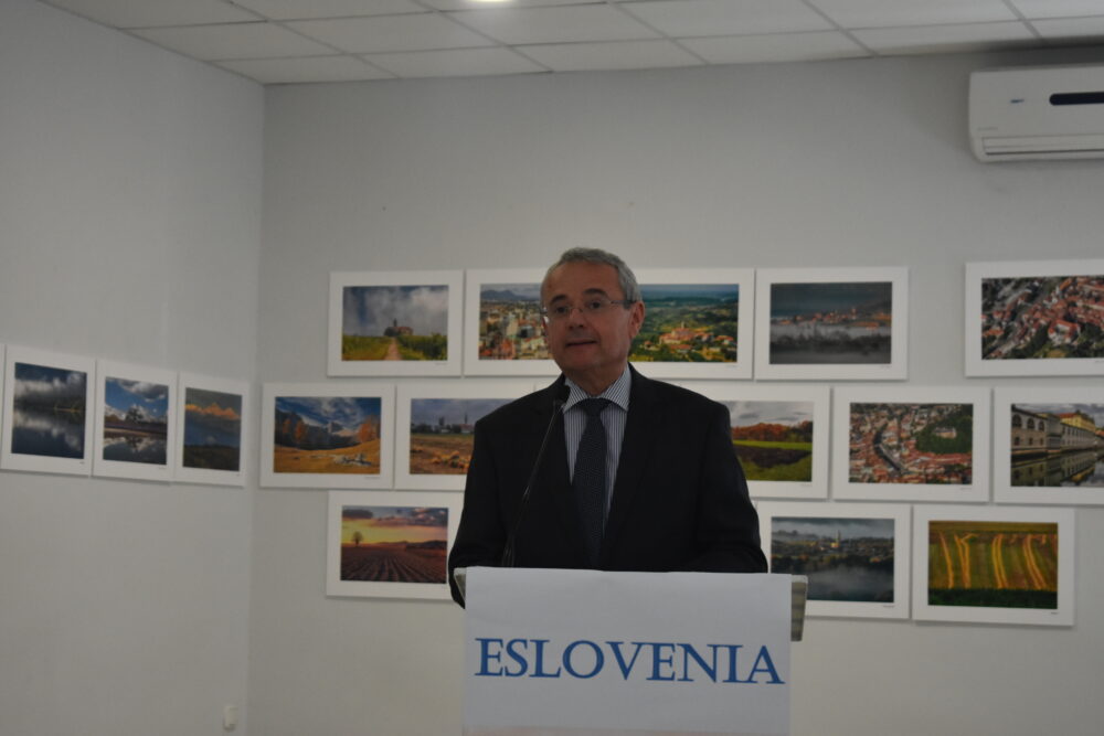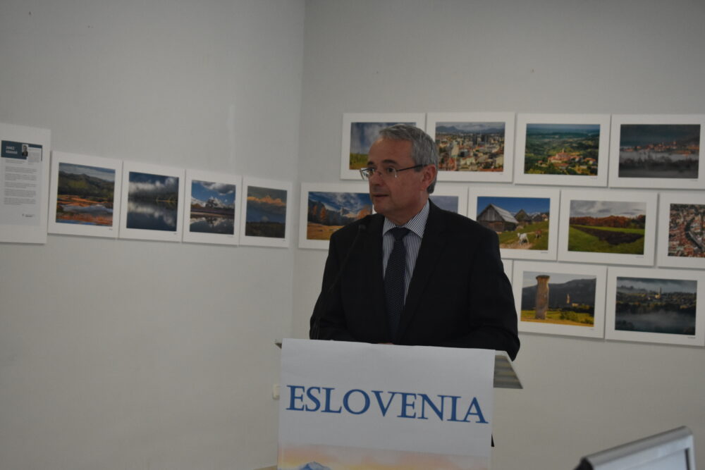 Primeramente, se han reunido en la Biblioteca Municipal junto a Cienlee para inaugurar la exposición fotográfica del galardonado maestro de fotografía Janez Kramar, en una exhibición de obras que representan los diferentes paisajes eslovenos. Elena Novillo, directora de la Biblioteca Municipal, ha querido agradecer la presencia del Embajador esloveno, así como de todos los presentes a la inauguración y ha dado paso al Embajador para que presentara las diferentes imágenes que muestran la versatilidad geográfica y cultural del país.