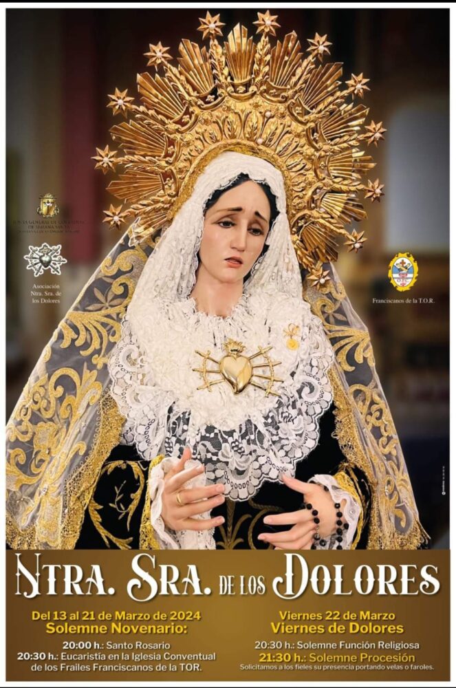 De esta manera, del 13 al 21 de marzo tendrá lugar el Solemne Novenario, con un horario de: a las 20:00h el Santo Rosario, y a las 20:30h, Eucaristía en la Iglesia Conventual de los Frailes Franciscanos de la TOR.