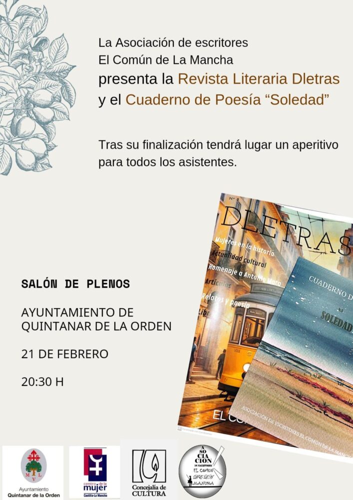 Este viernes 21 de febrero se ha celebrado en Quintanar de la Orden la presentación de la revista “Dletras” y el Cuaderno de Poesía “Soledad” a cargo de la...
