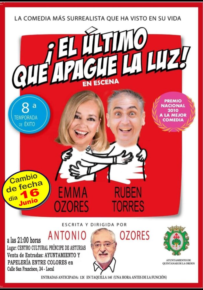 El próximo domingo 16 de junio a las 21:00h tendrá lugar en el Centro Cívico “Príncipe de Asturias” de Quintanar de la Orden la comedia de Emma Ozores y Rubén...