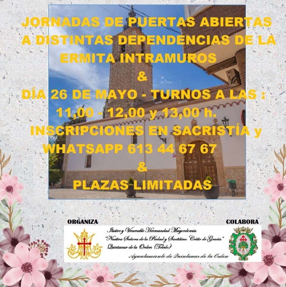 El próximo domingo 26 de mayo tendrá lugar la Jornada de Puertas Abiertas a las distintas dependencias de la Ermita Intramuros de Quintanar de la Orden. Las...