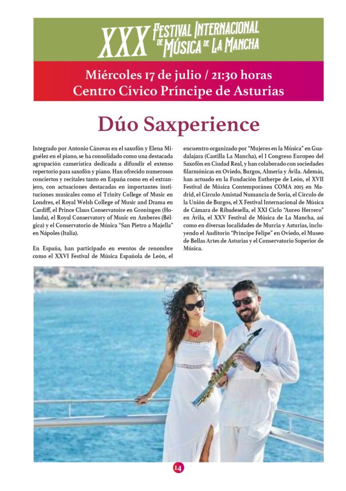 17 julio 2024 / 21:30 El próximo miércoles 17 de julio a las 21:30 se celebrará el concierto “Dúo Saxperience” en el Centro Cívico “Príncipe...
