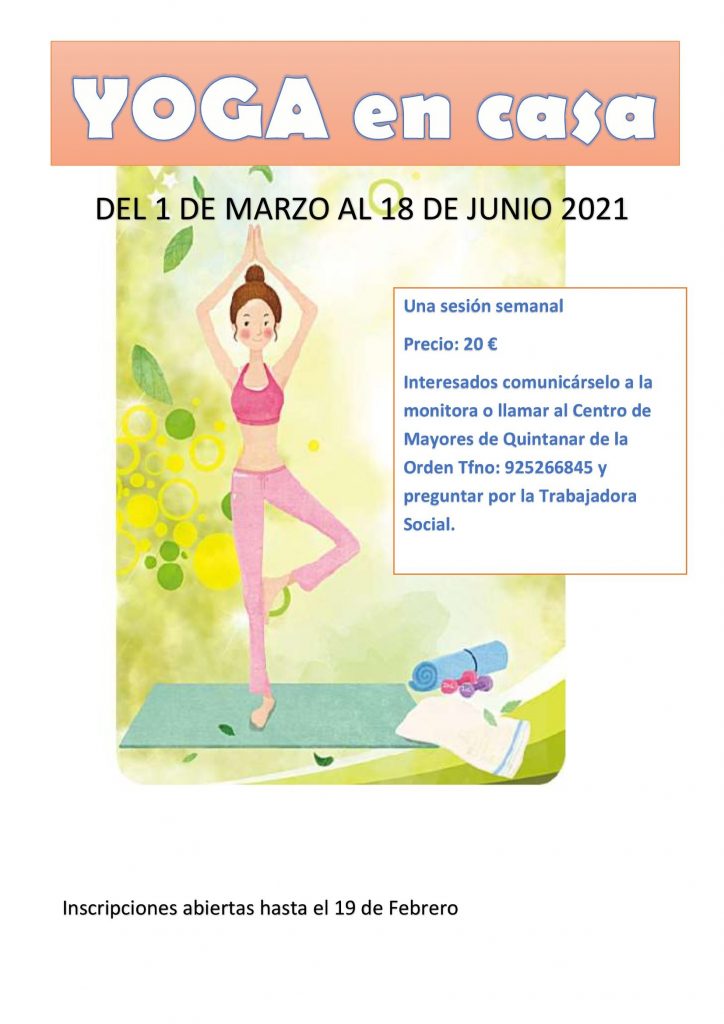 El Centro de Mayores abre el plazo de inscripción para yoga en modalidad on-line durante el primer semestre de 2021. En concreto, el curso se extenderá del 1 de marzo al 18 de junio, constará de una hora semanal y tiene un precio de 20 €.
